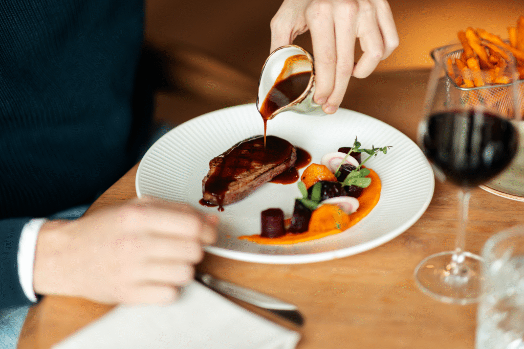 Met crème van wortel | mini rode biet | chioggia biet | zoete aardappel friet | saus à l’orange